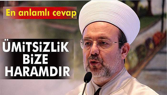 Terör örgütlerin asıl gayelerinden birinin de milletin umudunu yok etmek olduğunu vurgulayan Görmez, “Bu terör ve cinayet şebekelerinin çocuklarımızı katlederken insanlarımızı yok ederken hedeflerine koydukları ikinci gaye bu milletin umudunu yok etmek, hayata bağını koparmak, inancını, değerlerini, medeniyetini ve aidiyet duygusunu yok etmek. Oysa biz öyle bir inancın mensuplarıyız ki, ümitsizlik bize haramdır” diye konuştu. Görmez, terör örgütlerin üçüncü gayesinin ise, “bu milleti yeryüzündeki mazlumların, mağdurların umudu olmaktan çıkarmak” olduğunu belirterek, şunları kaydetti: