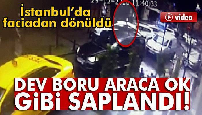 İstanbul'da dün yaşanan fırtına nedeniyle çok sayıda olumsuzluk yaşanırken, Karaköy'de faciadan dönüldü. Cadde üzerinde seyir halinde giden aracın tavanına fırtına nedeniyle yerinden kopan afiş taşıyan boru ok gibi saplandı.Boru aracın döşemesine kadar girerken, 8 metrelik boru vatandaşların yardımıyla çıkarıldı. Olayda ölen ya da yaralan olmazken ,o anlar güvenlik kameralarına saniye saniye yansıdı. Görüntülerde rüzgarda savrulan borunun aracın tavanına girişi görülüyor. Vatandaşlar olayı görür görmez yardıma koşuyor. Araç sürücüsü de araçtan hızla inerek, aracın fotoğrafını çekiyor.