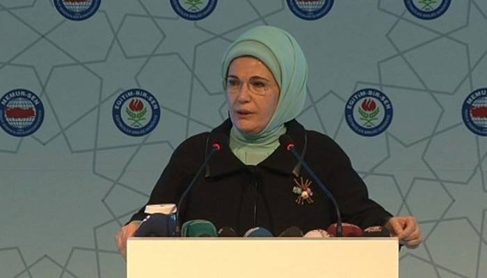 Vakıf ve derneklerin adeta bir okul olduğuna vurgu yapan Emine Erdoğan, "Okuma programlarından, sosyal organizasyonlara, kadınlarımız kendilerini bugünlere çok iyi hazırlamıştır. Bu sağlam temel üzerinde sabrederek bugünün milletvekilleri, akademisyenleri, yazarları, sanatçıları olmuşlardır. Sanattan siyasete, akademiden bürokrasiye ruhu bu kutlu maya ile mayalanmış yeni nesillere ihtiyacımız var. Eğitim Bir-Sen çatısı altındaki tüm eğitimcilere çok önemli sorumluluklar düşmektedir. Hem bu mücadele ruhunu korumak hem de değişimle gelen sorunlarımıza çözümler üretmek durumundayız. Yeni bir çağa girdik. Artık yeni bir insanla karşı karşıyayız. Bütün eğitim planlarımızı bu değişimi göz önüne alarak yapmalıyız. Ama bunu yaparken kadim bilgiyi güncelleyerek bugüne taşımalıyız. Bugün çocuklarımıza verdiğimiz eğitim geleceğimizin aynasıdır. Evlatlarımızı teknolojinin esaretinden kurtararak kabiliyetlerini açığa çıkaran bir anlayışla yetiştirelim" dedi.