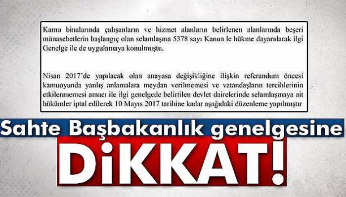 Sosyal medyada yayınlanan sahte genelgenin aslının ise özürlüler için yayınlanan genelge olduğu öğrenildi. Başbakanlık kaynakları, sosyal medyada dolaşan sözde Başbakanlık genelgesinin tamamen asılsız olduğunu açıkladı.