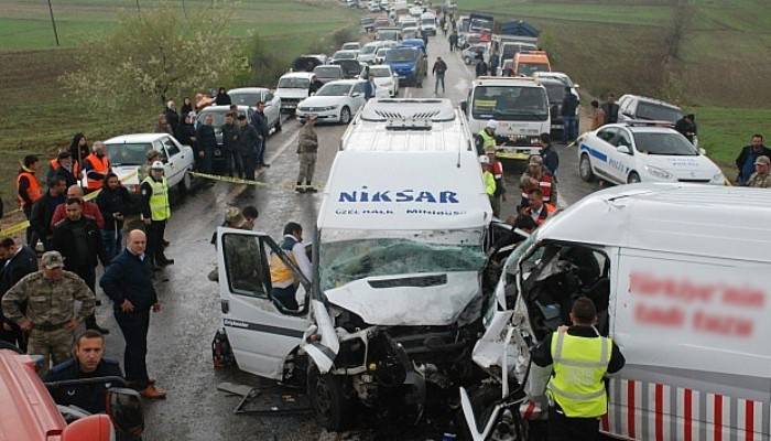 Edinilen bilgiye göre, Niksar ilçesinden Tokat’a yolcu taşıyan Vedat Buyar idaresindeki 60 NJ 981 plakalı minibüs, D-850 karayolu Musapınarı 12'nci kilometresinde sollama yaptığı sırada karşı yönden gelen Halil Ejder idaresindeki 60 HS 881 plakalı panelvan araçla çarpıştı. Kazada minibüste bulunan 14 yolcu ile her iki aracın şoförü yaralandı. Yaralılar, olay yerine sevk edilen çok sayıda ambulansla Niksar ile Tokat'taki hastanelere sevk edildi.