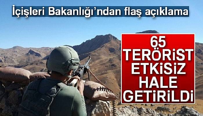 Ülke genelinde yürütülen bu operasyonlarda, 38'i ölü, 11'i teslim, 16'sı sağ olmak üzere toplam 65 teröristin etkisiz hale getirildiği vurgulandı.