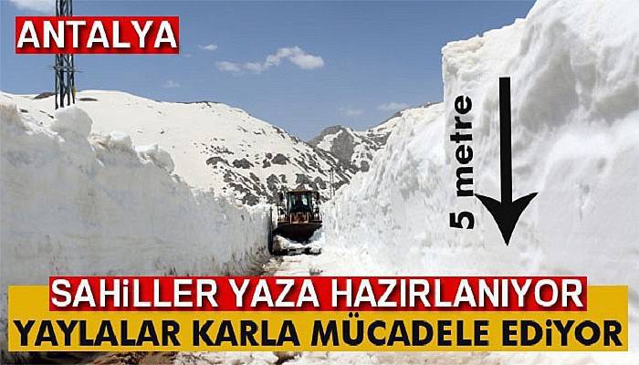Antalya, yaz ve kışı aynı anda yaşıyor. Havaların ısınmasıyla sahillerde yaz görüntüleri yaşanırken, yaylalarda ise kış manzaraları devam ediyor. Kış mevsiminin Antalya’nın iklim şartlarına göre daha erken başlayıp, geç bittiği Gündoğmuş ilçesine bağlı Söbüçimen Yaylası’nda halen kış şartları hüküm sürüyor. Bölgedeki hayvancılıkla uğraşan vatandaşların yaz aylarında merası konumundaki Söbüçimen Yaylası’nda sert geçen kış mevsimi boyunca yollar, kar nedeniyle ulaşıma kapandı. Antalya Büyükşehir Belediyesi de, hayvancılıkla uğraşan vatandaşların yazın mera olarak kullandığı yaylanın karla kaplı yollarını göç zamanından önce ulaşıma açabilmek için çalışma başlattı. Mayıs ayı olmasına rağmen kar kalınlığının yer yer 5 metreyi bulduğu yayla yolunda iş makineleriyle hummalı bir çalışma yürütülüyor.