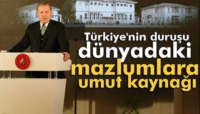 Türkiye'nin dünyanın her yerinde mazlumlar için bir umut kaynağı olduğunu söyleyen Erdoğan, "Türkiye'nin duruşu, dünyanın her yerindeki mazlumlar ve mağdurlar için de bir umut kaynağı olacaktır. Zaten halklar nezdinde bir sıkıntı yok. Sıkıntı başka yerde. Bu bakımdan sorumluluğumuz çok ağır. Kendimizle birlikte bölgemizde ve dünyada üstlendiğimiz misyonun hakkını vermek, millet ve devlet olarak boynumuzun borcudur. Milletimizin tamamının katkılarıyla oluşturulacak bir fon aracılığıyla mübarek üç aylar boyunca Mekke ve Medine'de bulunan dünyanın her köşesinden gelmiş gariplere yardım ulaştıracak bir mekanizmayı da kurabiliriz. Bunun da gayreti içinde olmamız gerekir diye düşünüyorum” ifadelerini kullandı.