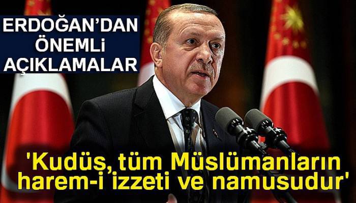 “Biz Mescid-i Aksa dediğimiz zaman onu orada Harem-i Şerif olarak ifade etmeyi eksik görüyoruz. Kubbet-üs Sahra’da hepsi içindedir. Kimse kimseyi aldatmasın. Bunun mücadelesini bütünüyle bu şekilde veriyoruz” diyen Cumhurbaşkanı Erdoğan, “Kudüs 3 semavi din için de kutsal bir şehirdir. Bütün insanlık tarihinin özüdür, özetidir. Filistin’in milli şairi merhum Mahmut Derviş, ‘Kadim surlar içinde yürüyorum Kudüs’te, bir zaman diliminden diğerine’ dizeleri ile Kudüs’ün bu vasfını çok güzel anlatır. Nuri Pakdil de Kudüs’ün zamanı ve mekanı aşan önemini kelimelere şöyle döker; ‘Tur Dağı'nı yaşa ki, bilesin nerede Kudüs. Ben Kudüs’ü kol saati gibi taşıyorum. Ayarlanmadan Kudüs’e boşuna vakit geçirirsin, buz tutar gözün, görmez olur. Kudüs’te zaman bizim bildiğimiz vakitlere göre değil, kendi mecrasına akar. Kudüs aşktır, hasrettir. İnsanlığın gönlünün nuru, gönlünün sürurudur. Kudüs yeryüzünde arşı alaya en yakın yerdir. Çünkü Kudüs İsra’nın ikinci durağı, miracın ilk basamağıdır. Kudüs tüm Müslümanların harem-i izzeti ve namusudur. Burada bizlere pusula olması için bir hadisi şerifi nakletmek isterim. Bir gün Hz. Meymune, Peygamber Efendimize Mescid-i Aksa için 'Hüküm nedir?' diye sorar. Bunun üzerine Efendimiz, ‘Oraya gidin ve orada namaz kılın’ buyurur. Hz. Meymune tekrar sorar; 'Gidemezsek ne yapmamız gerekir?' Efendimiz o zaman kandillerinde yakılmak üzere yağ gönderin der. Efendimiz bir başka hadislerinde yolculuk yalnız üç mescidedir, Mescid-i Haram, Mescid-i Nebevi ve Mescid-i Aksa'dır diye buyurmuşlardır” dedi.