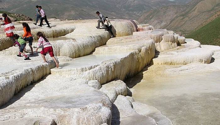 Havaların ısınması ile beraber vatandaşların şifa bulmak için aileleriyle travertenlere gelen çocuklar, hem manzaranın hem de sıcak suyun tadını çıkarıyor.