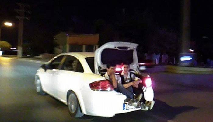 Merkezefendi ilçesindeki 29 Ekim Bulvarında merkeze doğru seyir halinde olan bir otomobil görenleri hayrete düşürdü. Beyaz bir otomobilin bagajındaki yaşları 8 ile 12 arasında değişin iki çocuk şaşırttı. Kamerayı gören çocuklar yüzlerini kapatırken, diğer vatandaşlar hayretler içinde durumu seyretti. Aracın içinde ise 6 kişinin olması dikkat çekti.