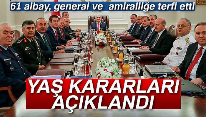 Yapılan açıklamaya göre; bugün gerçekleştirilen YAŞ toplantısında TSK’da görevli general-amiral ve albaylardan; bir üst rütbeye yükseltilecekler, görev süresi uzatılacaklar, kadrosuzluk ve yaş haddinden emekliye edileceklerin durumları görüşülerek karara bağlandı. 30 Ağustos 2017 tarihinden geçerli olmak üzere; 6 general-amiral bir üst rütbeye, 61 albay ise general-amiralliğe terfi etti. 8 generalin görev süreleri 1 yıl, 168 albayın görev süreleri ise 2 yıl uzatıldı.
