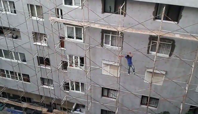 İstanbul’da geçtiğimiz günlerde Beylikdüzü ve Mecidiyeköy’de 10 katlı bir binanın dış cephesine kurulan iskelenin üzerinde hiçbir güvenlik önlemi almadan çalışan işçilerin ardından Şişli Teşvikiye’de de hayrete düşüren bir görüntü ortaya çıktı. 6 katlı bir binanın dış cephesine kurulan iskeleden halat, kask ve koruyucu kıyafet giymeden tehlikeli bir şekilde aşağıya inen “örümcek işçi” bu kadarına da “pes” dedirtti. Akrobasi hareketleriyle aşağıya inerek yürekleri ağza getiren işçinin iskelesinin demirlerine tutunarak indiği o anlar cep telefonu kamerasına yansıdı.