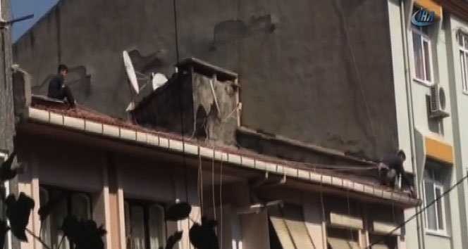 Olay, dün Bahçelievler Şirinevler Mahallesi'nde yaşandı. 5 katlı binanın çatısına yağmur ve kar sularının birikmemesi için yapılan kanal tıkandı. Tıkanan kanalı açmak için çatıya çıkan 2 kişi iş güvenliğini hiçe saydı. İşçilerden birisi beline bağladığı iple arkadaşının sözde güvenliğini sağladı. Yaşananlar bir cep telefonu kamerası tarafından kaydedilirken, görüntüyü izleyenlerinin ise yürekleri ağzına geldi.
