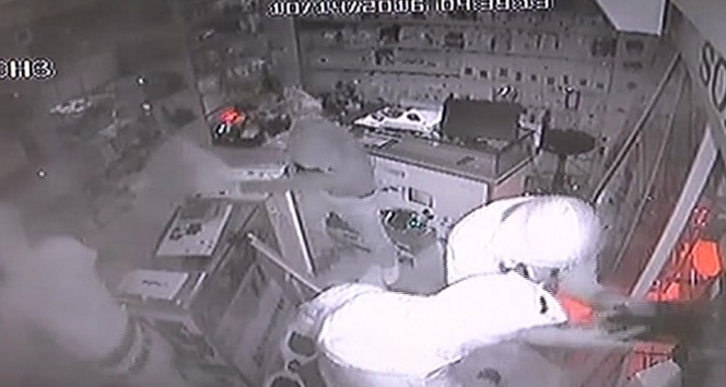 Güvenlik kameralarına yansıyan görüntülerde, hırsızlar iş yerinin önüne gelerek el birliğiyle kepengini kaldırıyor. Ardından içeriye giren hırsızlar, güç uygulayarak kapıyı kırıyor. Kapının kırılmasının ardından içeriye doluşan soyguncular, iş yerindeki malzemeleri poşetlere dolduruyor. Bir süre sonra alarmın çalmasıyla soyguncular apar topar iş yerinden çıkarak kayıplara karışıyor.